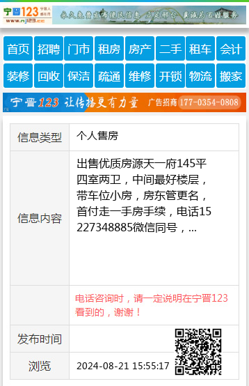 出售优质房源天一府145平四室两卫,中间最好楼层,带车位小房,房东管更名,首付走一手房手续,电话15227348885微信同号, 【电话咨询时,请一定说明在宁晋123看到的,谢谢!】 |