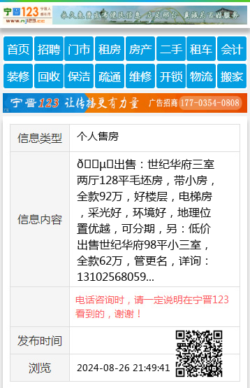 🏵️出售:世纪华府三室两厅128平毛坯房,带小房,全款92万,好楼层,电梯房,采光好,环境好,地理位置优越,可分期,另:低价出售世纪华府98平小三室,全款62万,管更名,详询:13102568059 【电话咨询时,请一定说明在宁晋123看到的,谢谢!】 |
