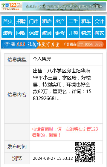 出售:八小学区房世纪华府98平小三室,学区房,好楼层,特别实用,环境也好全款62万,管更名,详询:15832926681 【电话咨询时,请一定说明在宁晋123看到的,谢谢!】 |