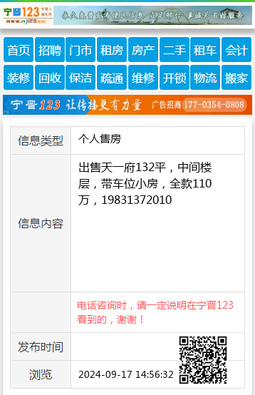 出售天一府132平,中间楼层,带车位小房,全款110万,19831372010