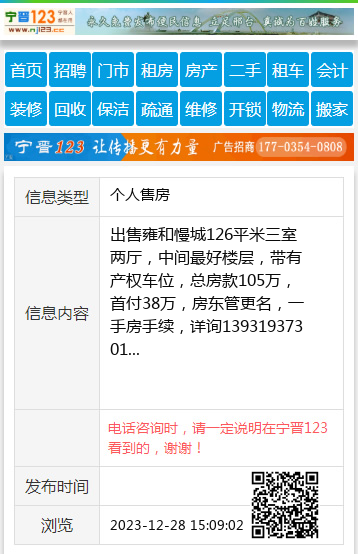 出售雍和慢城126平米三室两厅,中间最好楼层,带有产权车位,总房款105万,首付38万,房东管更名,一手房手续,详询13931937301 【电话咨询时,请一定说明在宁晋123看到的,谢谢!】 |