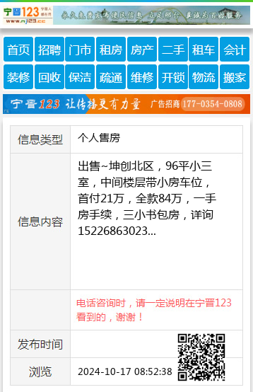 出售~坤创北区,96平小三室,中间楼层带小房车位,首付21万,全款84万,一手房手续,三小书包房,详询15226863023 【电话咨询时,请一定说明在宁晋123看到的,谢谢!】 |