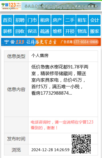 低价急售水榭花都91.78平两室,精装修带储藏间,赠送室内家具家电,总价45万,首付5万,满五唯一小税,看房17732988874 【电话咨询时,请一定说明在宁晋123看到的,谢谢!】 |