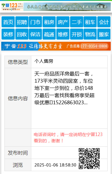 天一府品质洋房最后一套,173平米灵动四居室,车位地下室一步到位,总价148万最后一套找我看房享受超级优惠☎15226863023 【电话咨询时,请一定说明在宁晋123看到的,谢谢!】 |