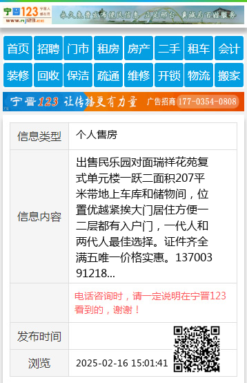 出售民乐园对面瑞祥花苑复式单元楼一跃二面积207平米带地上车库和储物间,位置优越紧挨大门居住方便一二层都有入户门,一代人和两代人最佳选择。证件齐全满五唯一价格实惠。13700391218 【电话咨询时,请一定说明在宁晋123看到的,谢谢!】 |