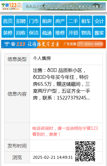 出售:🏠品质新小区,🌟今年买今年住,特价房65.5万,赠送储藏间,三室两厅户型,五证齐全一手房,联系:15227379245 【电话咨询时,请一定说明在宁晋123看到的,谢谢!】 |