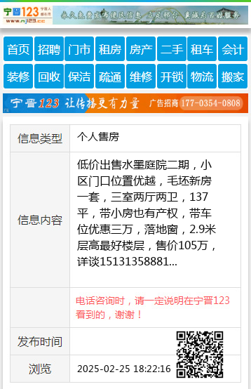 低价出售水墨庭院二期,小区门口位置优越,毛坯新房一套,三室两厅两卫,137平,带小房也有产权,带车位优惠三万,落地窗,2.9米层高最好楼层,售价105万,详谈15131358881 【电话咨询时,请一定说明在宁晋123看到的,谢谢!】 |
