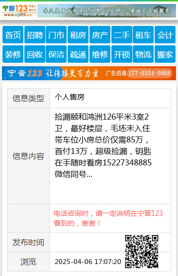 捡漏颐和鸿洲126平米3室2卫,最好楼层,毛坯未入住带车位小房总价仅需85万,首付13万,超级捡漏,钥匙在手随时看房15227348885微信同号 【电话咨询时,请一定说明在宁晋123看到的,谢谢!】 |