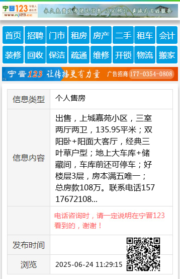 出售,上城嘉苑小区,三室两厅两卫,135.95平米;双阳卧+阳面大客厅,经典三叶草户型;地上大车库+储藏间,车库前还可停车;好楼层3层,房本满五唯一;总房款108万。联系电话15717672108 【电话咨询时,请一定说明在宁晋123看到的,谢谢!】 |