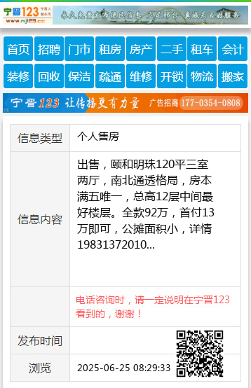 出售,颐和明珠120平三室两厅,南北通透格局,房本满五唯一,总高12层中间最好楼层。全款92万,首付13万即可,公摊面积小,详情19831372010 【电话咨询时,请一定说明在宁晋123看到的,谢谢!】 |