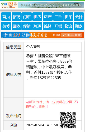 急售!世爵公馆138平精装三室,带车位小房,85万价格能谈,中上最好楼层,低税,首付13万即可拎包入住,看房13231922605 【电话咨询时,请一定说明在宁晋123看到的,谢谢!】 |