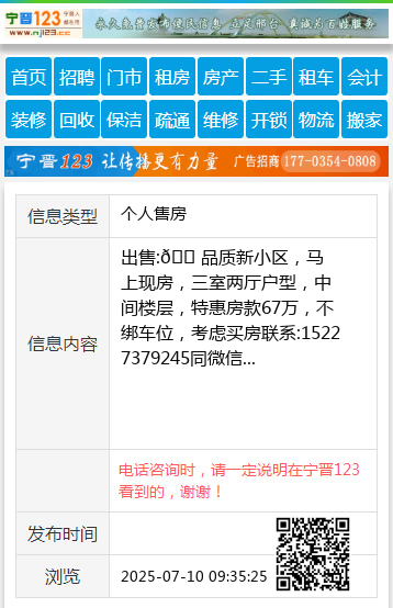 出售:🏠品质新小区,马上现房,三室两厅户型,中间楼层,特惠房款67万,不绑车位,考虑买房联系:15227379245同微信 【电话咨询时,请一定说明在宁晋123看到的,谢谢!】 |