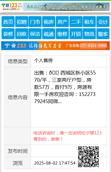 出售:🏠西城区新小区5570/平,三室两厅户型,房款57万,首付9万,房源有限一手房欢迎咨询:15227379245同微 【电话咨询时,请一定说明在宁晋123看到的,谢谢!】 |