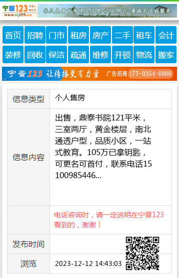 出售,鼎泰书院121平米,三室两厅,黄金楼层,南北通透户型,品质小区,一站式教育。105万已拿钥匙,可更名可首付,联系电话15100985446 【电话咨询时,请一定说明在宁晋123看到的,谢谢!】 |
