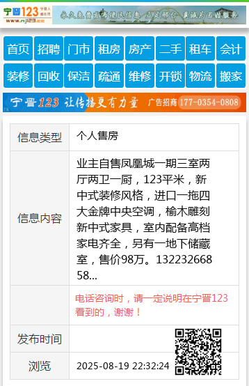 业主自售凤凰城一期三室两厅两卫一厨,123平米,新中式装修风格,进口一拖四大金牌中央空调,榆木雕刻新中式家具,室内配备高档家电齐全,另有一地下储藏室,售价98万。13223266858 【电话咨询时,请一定说明在宁晋123看到的,谢谢!】 |