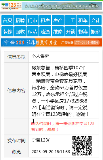 房东急售,康桥四季107平两室跃层,电梯房最好楼层,精装修带全套家具家电,带小房,全款63万首付仅需12万,房东承担全部过户税费,一小学区房17732988874 【电话咨询时,请一定说明在宁晋123看到的,谢谢!】 |