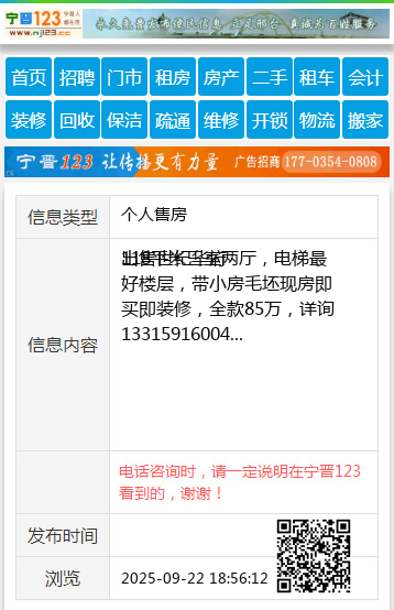 118平米三室两厅,电梯最好楼层,带小房毛坯现房即买即装修,全款85万,详询13315916004 【电话咨询时,请一定说明在宁晋123看到的,谢谢!】 |