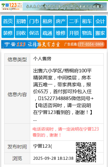 出售六小学区/梧桐府100平精装两室,中间楼层,房本满五唯一,带家具家电,报价65万,首付即可拎包入住,☎15227348885微信同号+ 【电话咨询时,请一定说明在宁晋123看到的,谢谢!】 |