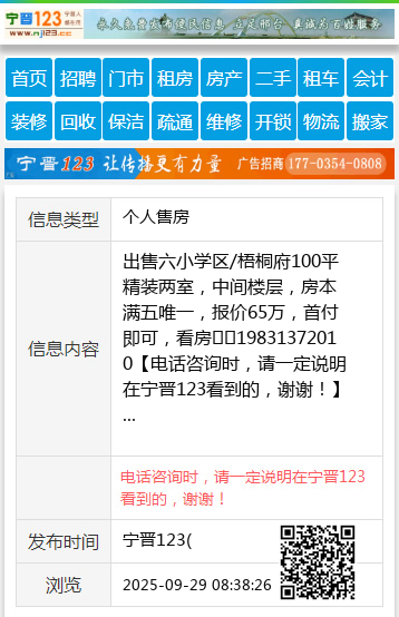 出售六小学区/梧桐府100平精装两室,中间楼层,房本满五唯一,报价65万,首付即可,看房☎️19831372010 【电话咨询时,请一定说明在宁晋123看到的,谢谢!】 |