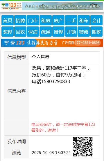 急售,颐和绿洲117平三室,报价60万,首付9万即可,电话15803290833