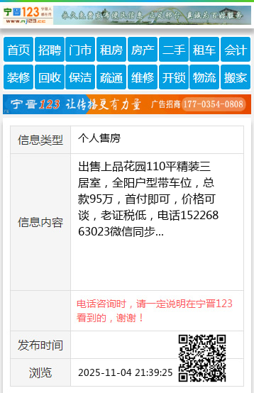 出售上品花园110平精装三居室,全阳户型带车位,总款95万,首付即可,价格可谈,老证税低,电话15226863023微信同步 【电话咨询时,请一定说明在宁晋123看到的,谢谢!】 |