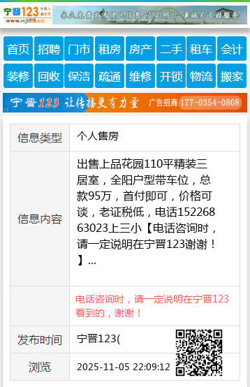 出售上品花园110平精装三居室,全阳户型带车位,总款95万,首付即可,价格可谈,老证税低,电话15226863023上三小 【电话咨询时,请一定说明在宁晋123看到的,谢谢!】 |