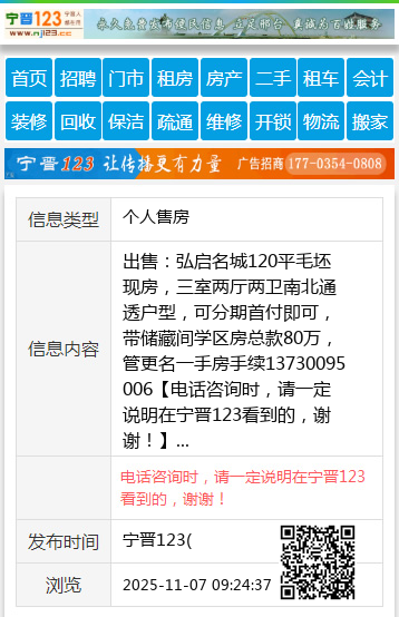 出售:弘启名城120平毛坯现房,三室两厅两卫南北通透户型,可分期首付即可,带储藏间学区房总款80万,管更名一手房手续13730095006 【电话咨询时,请一定说明在宁晋123看到的,谢谢!】 |