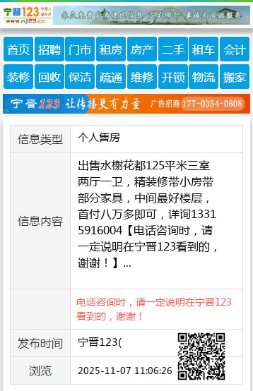出售水榭花都125平米三室两厅一卫,精装修带小房带部分家具,中间最好楼层,首付八万多即可,详询13315916004 【电话咨询时,请一定说明在宁晋123看到的,谢谢!】 |