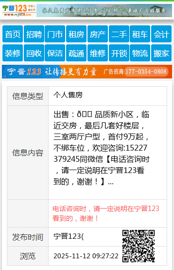 出售:🏠品质新小区,临近交房,最后几套好楼层,三室两厅户型,首付9万起,不绑车位,欢迎咨询:15227379245同微信 【电话咨询时,请一定说明在宁晋123看到的,谢谢!】 |