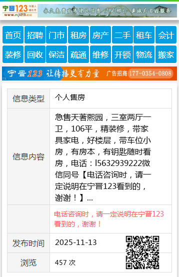急售天著熙园,三室两厅一卫,106平,精装修,带家具家电,好楼层,带车位小房,有房本,有钥匙随时看房,电话:l5632939222微信同号 【电话咨询时,请一定说明在宁晋123看到的,谢谢!】 |