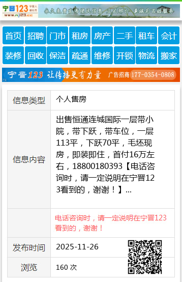 出售恒通连城国际一层带小院,带下跃,带车位,一层113平,下跃70平,毛坯现房,即装即住,首付16万左右,18800180393 【电话咨询时,请一定说明在宁晋123看到的,谢谢!】 |