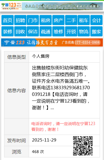出售鼓楼东街妇幼保健院东侧焦家庄二层楼西侧门市,证件齐全水电齐备滿五唯一。联系电话1383392936813700391218 【电话咨询时,请一定说明在宁晋123看到的,谢谢!】 |