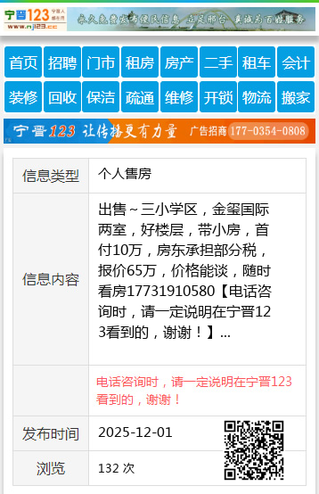 出售~三小学区,金玺国际两室,好楼层,带小房,首付10万,房东承担部分税,报价65万,价格能谈,随时看房17731910580 【电话咨询时,请一定说明在宁晋123看到的,谢谢!】 |