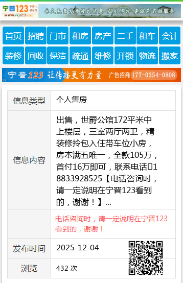 出售,世爵公馆172平米中上楼层,三室两厅两卫,精装修拎包入住带车位小房,房本满五唯一,全款105万,首付16万即可,联系电话☎18833928525 【电话咨询时,请一定说明在宁晋123看到的,谢谢!】 |