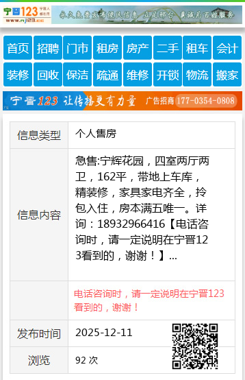急售:宁辉花园,四室两厅两卫,162平,带地上车库,精装修,家具家电齐全,拎包入住,房本满五唯一。详询:18932966416 【电话咨询时,请一定说明在宁晋123看到的,谢谢!】 |