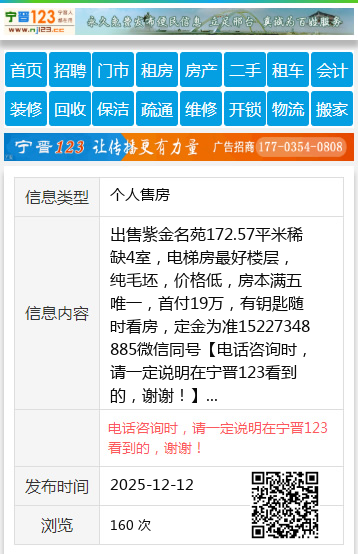 出售紫金名苑172.57平米稀缺4室,电梯房最好楼层,纯毛坯,价格低,房本满五唯一,首付19万,有钥匙随时看房,定金为准15227348885微信同号 【电话咨询时,请一定说明在宁晋123看到的,谢谢!】 |