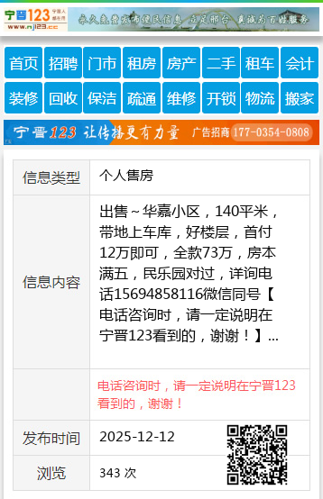 出售~华嘉小区,140平米,带地上车库,好楼层,首付12万即可,全款73万,房本满五,民乐园对过,详询电话15694858116微信同号 【电话咨询时,请一定说明在宁晋123看到的,谢谢!】 |