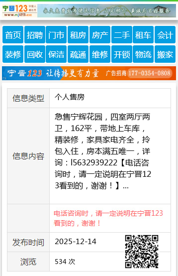 急售宁辉花园,四室两厅两卫,162平,带地上车库,精装修,家具家电齐全,拎包入住,房本满五唯一,详询:l5632939222 【电话咨询时,请一定说明在宁晋123看到的,谢谢!】 |
