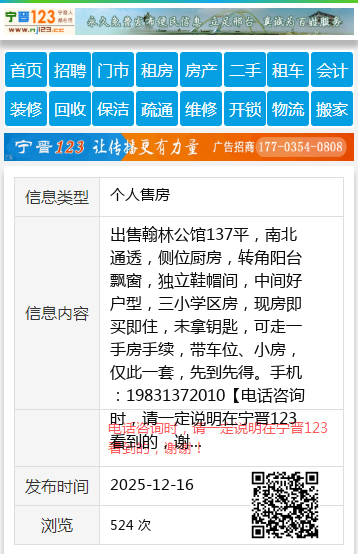 出售翰林公馆137平,南北通透,侧位厨房,转角阳台飘窗,独立鞋帽间,中间好户型,三小学区房,现房即买即住,未拿钥匙,可走一手房手续,带车位、小房,仅此一套,先到先得。手机:19831372010 【电话咨询时,请一定说明在宁晋123看到的,谢谢!】 |