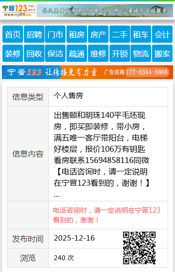 出售颐和明珠140平毛坯现房,即买即装修,带小房,满五唯一客厅带阳台,电梯好楼层,报价106万有钥匙看房联系15694858116同微 【电话咨询时,请一定说明在宁晋123看到的,谢谢!】 |