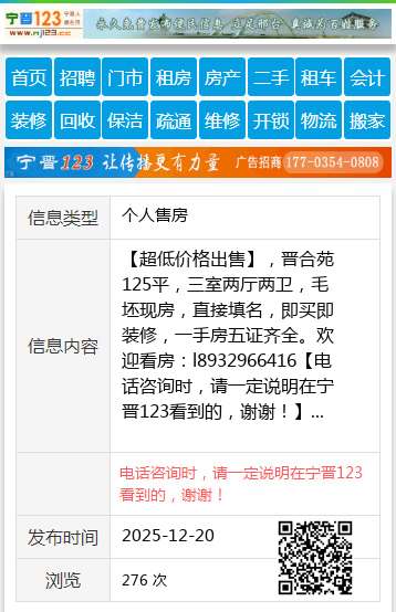 【超低价格出售】,晋合苑125平,三室两厅两卫,毛坯现房,直接填名,即买即装修,一手房五证齐全。欢迎看房:l8932966416 【电话咨询时,请一定说明在宁晋123看到的,谢谢!】 |