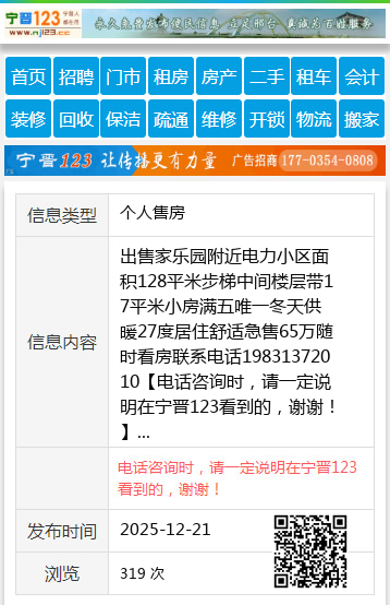 出售家乐园附近电力小区面积128平米步梯中间楼层带17平米小房满五唯一冬天供暖27度居住舒适急售65万随时看房联系电话19831372010 【电话咨询时,请一定说明在宁晋123看到的,谢谢!】 |