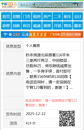 秒杀房源北辰原著116平米三室两厅两卫,中间楼层,总款86万,房东赔钱诚意出售,一手房手续,首付即可,联系15694858116同微 【电话咨询时,请一定说明在宁晋123看到的,谢谢!】 |