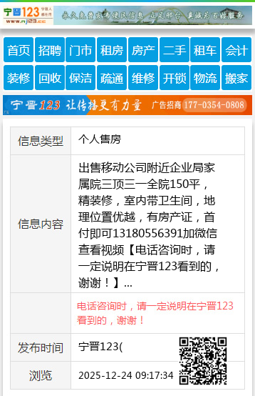 出售移动公司附近企业局家属院三顶三一全院150平,精装修,室内带卫生间,地理位置优越,有房产证,首付即可13180556391加微信查看视频 【电话咨询时,请一定说明在宁晋123看到的,谢谢!】 |