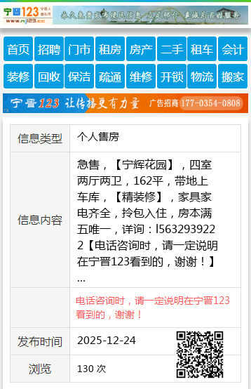 急售,【宁辉花园】,四室两厅两卫,162平,带地上车库,【精装修】,家具家电齐全,拎包入住,房本满五唯一,详询:l5632939222 【电话咨询时,请一定说明在宁晋123看到的,谢谢!】 |