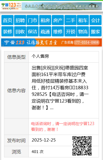 出售[庆祝][庆祝]德盛园四室面积161平米带车库过户费用低好楼层精装修基本未入住,首付14万看房☎️18833928525 【电话咨询时,请一定说明在宁晋123看到的,谢谢!】 |