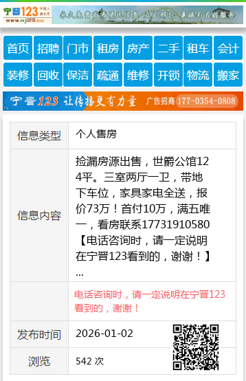 捡漏房源出售,世爵公馆124平。三室两厅一卫,带地下车位,家具家电全送,报价73万!首付10万,满五唯一,看房联系17731910580 【电话咨询时,请一定说明在宁晋123看到的,谢谢!】 |