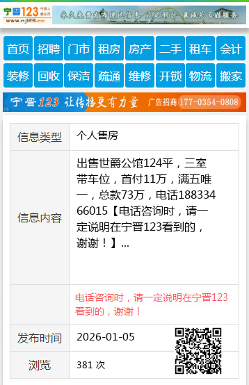 出售世爵公馆124平,三室带车位,首付11万,满五唯一,总款73万,电话18833466015