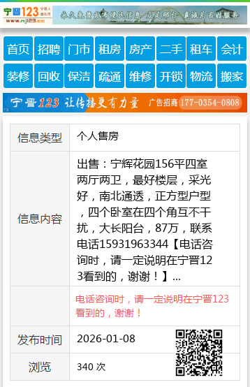出售:宁辉花园156平四室两厅两卫,最好楼层,采光好,南北通透,正方型户型,四个卧室在四个角互不干扰,大长阳台,87万,联系电话15931963344 【电话咨询时,请一定说明在宁晋123看到的,谢谢!】 |