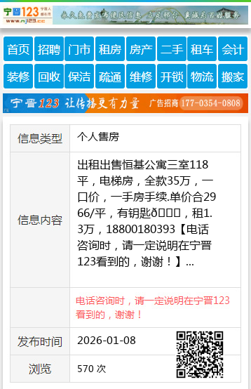 出租出售恒基公寓三室118平,电梯房,全款35万,一口价,一手房手续.单价合2966/平,有钥匙🔑,租1.3万,18800180393 【电话咨询时,请一定说明在宁晋123看到的,谢谢!】 |